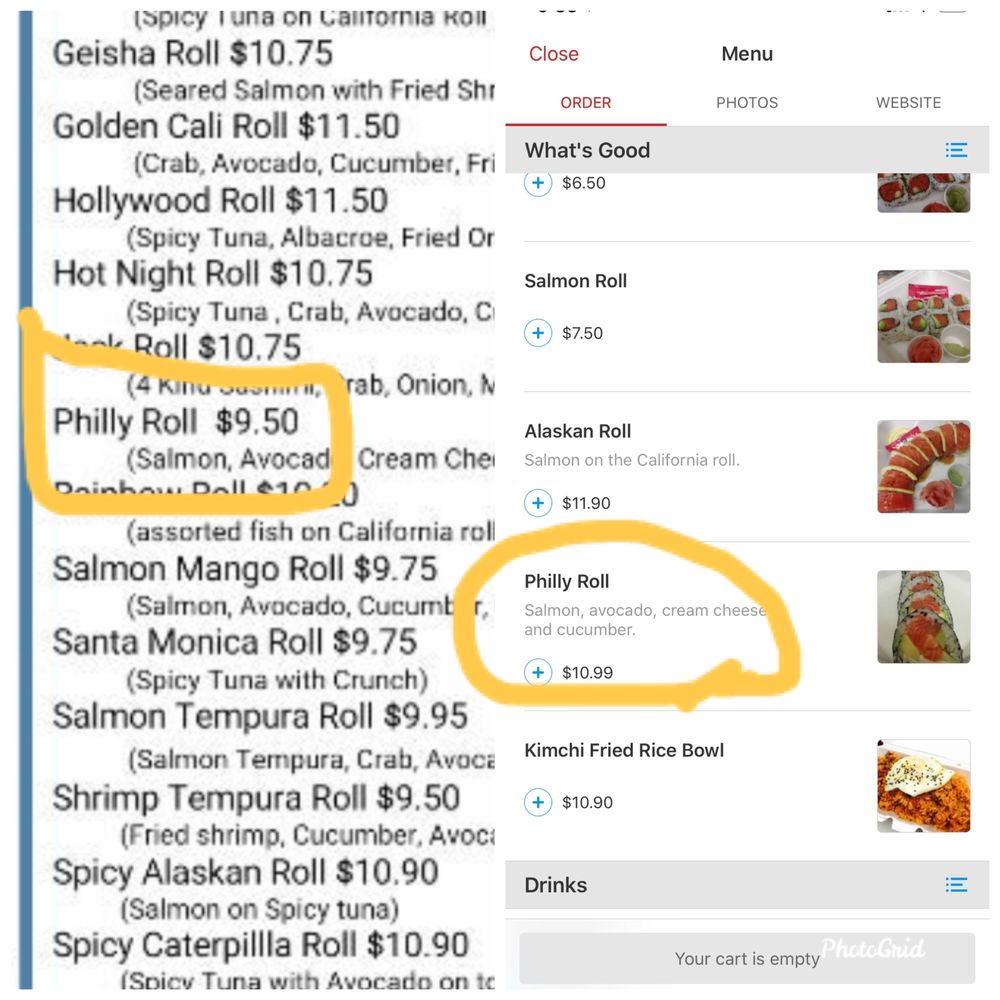 pcs.In : spicy tuna, cucumberOut : avocadoServed with a side of / sauce, wasabi, ginger, soy sauce.